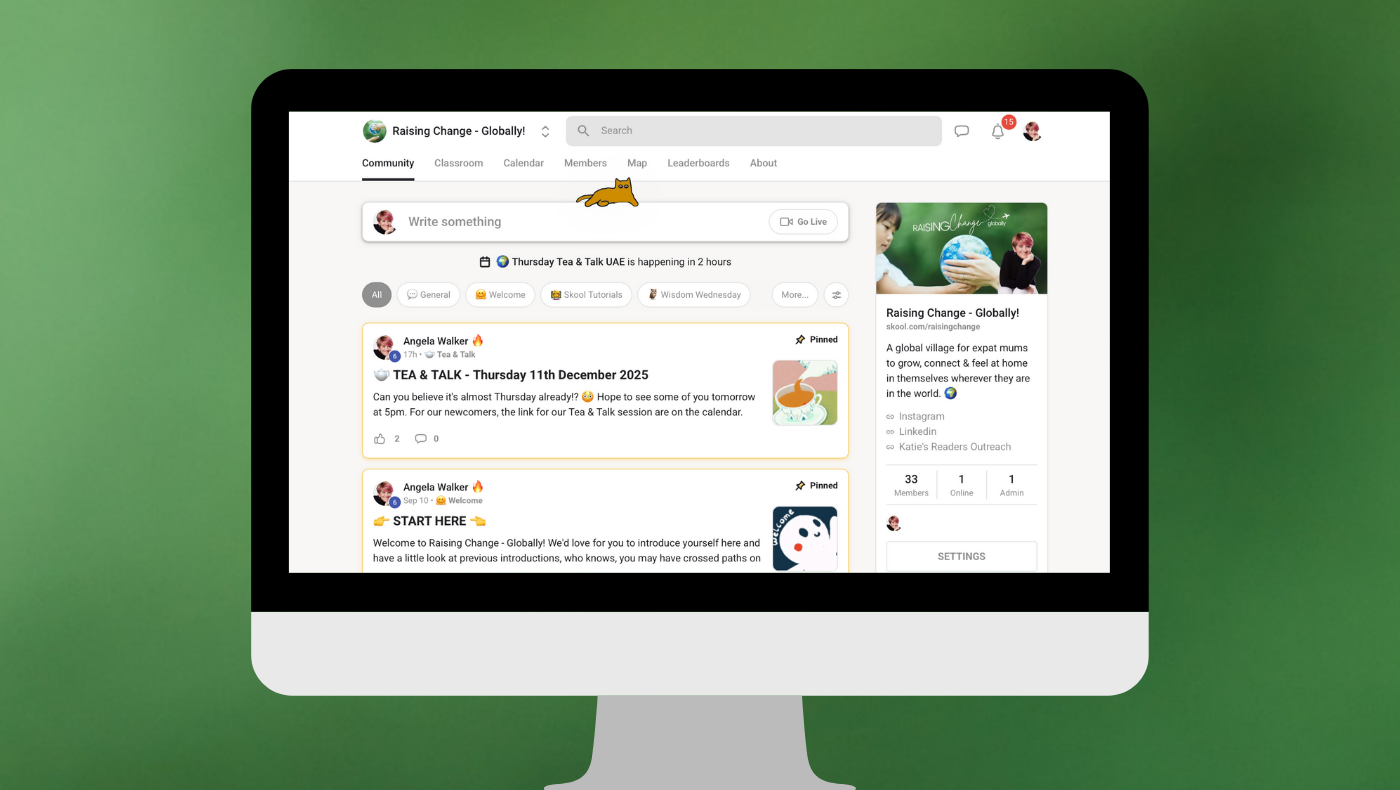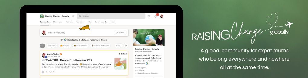 Inside our Raising Change Globally Village you’ll find everything you need to feel more grounded, supported and connected, no matter where in the world you’re living. It’s a soft place to land through the highs, the lows and the constant changes of expat life filled with mums who understand the emotional load you carry, the identity shifts you navigate and the everyday moments that only another expat parent would truly get.